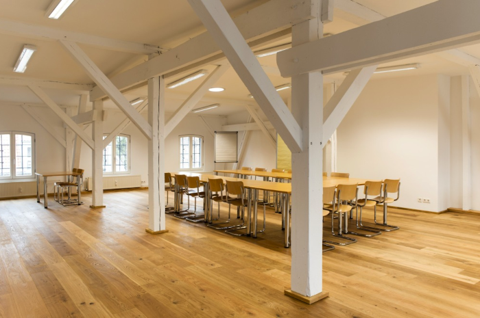 Die Tagungsräume 1, 2 und 3 liegen im 4. Obergeschoss, sie sind barrierefrei erreichbar und mit einer Behindertentoilette ausgestattet. Der Tagungsraum 5 liegt im Dachgeschoss und hat Werkstattcharakter. Klicken Sie einen Bereich im Grundriss an und lassen Sie sich durch unsere Räume führen, um einen Einblick in den Tagungsbereich zu gewinnen.